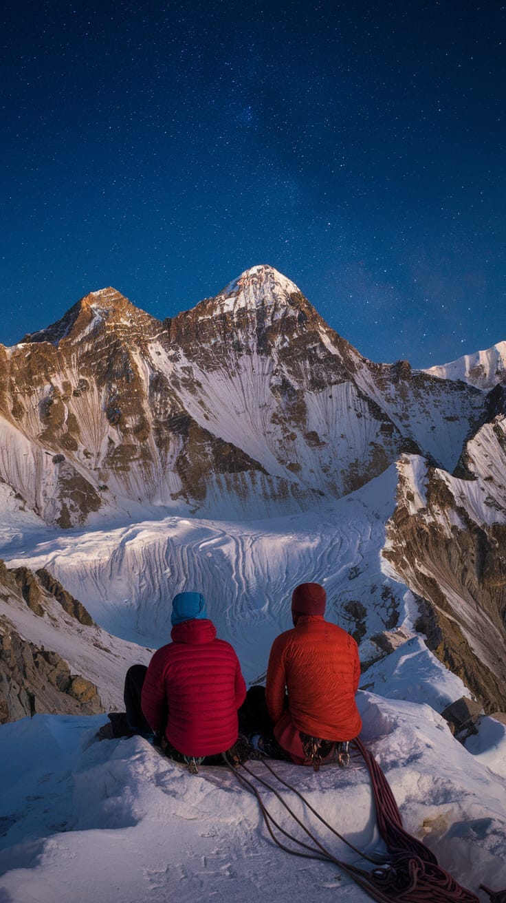 #7 - A scene showing two people resting at the summit of the Himalayas