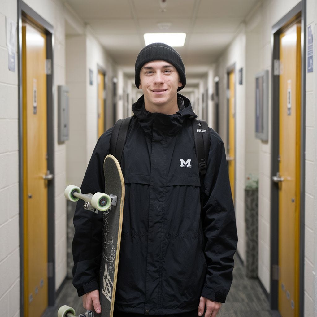 #9 - A photo of a student standing in front of a dorm room. The student is holding a skateboard and wearing a black jacket and a beanie.
