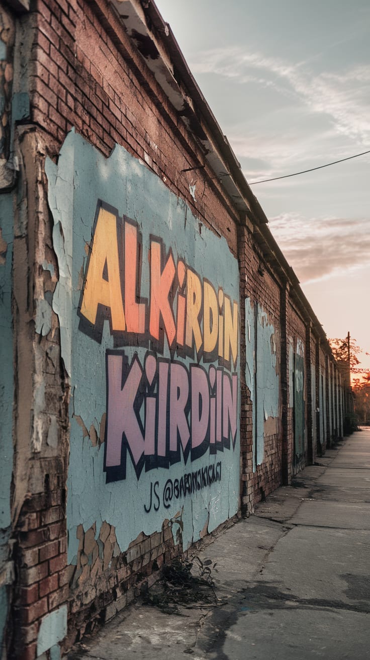 #8 - A photo of a weathered brick wall in a quiet neighborhood at dusk with graffiti on it