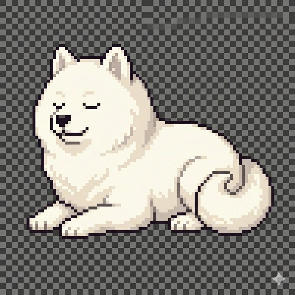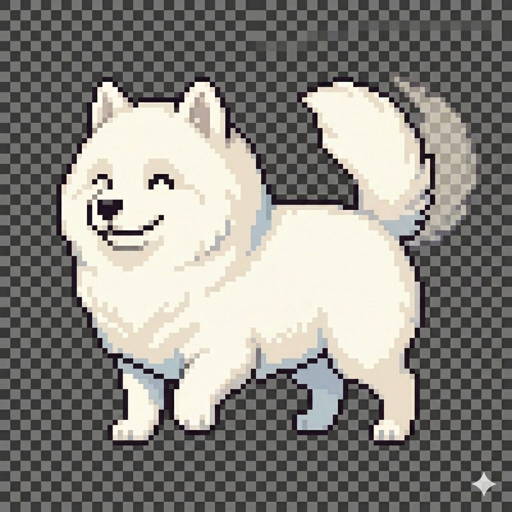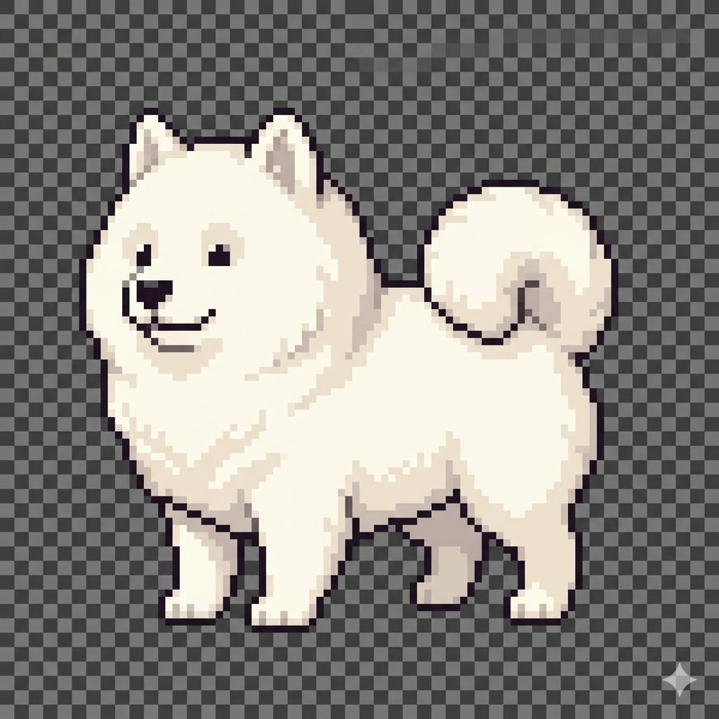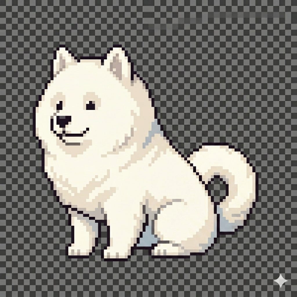 “Pixel art Samoyed dog sitting, same character as reference, fluffy white, side view, transparent background, 64x64”