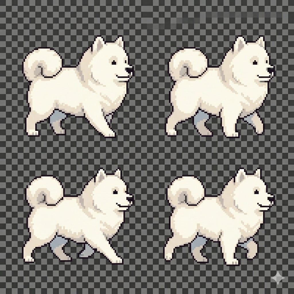 I tried a few AI image tools and Nano Banana Pro was the clear winner - specifically because of character consistency. Here’s the problem with most AI image generators: generate your dog in a walking pose, then generate her sitting, and you’ll get two different dogs. Different shading, different proportions, different face. It looks terrible in a sprite animation.