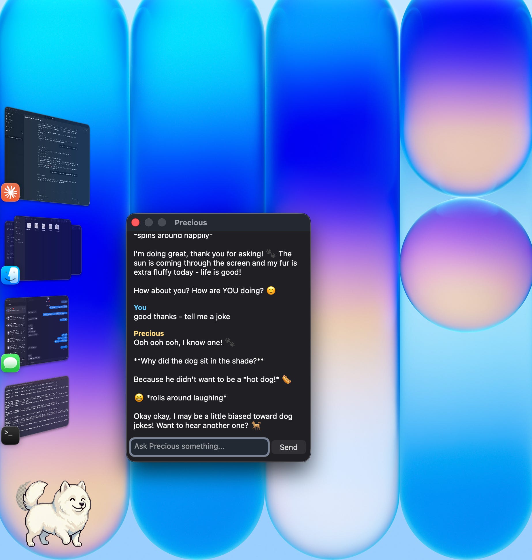 Precious is my 6-year-old Samoyed. She’s an enormous white cloud of fur who’s cute as anything, full of sass, quite clumsy, and deeply unimpressed by most things... I wanted her on my dock. I wanted to click her and chat with her. I had no idea how to build that. I did it anyway.